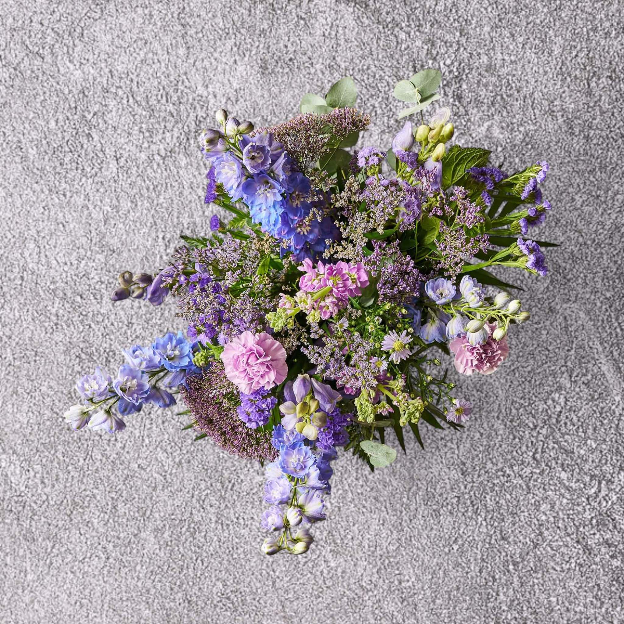 Blå Melodi er en harmonisk buket i kølige blå, lilla og rosa toner. En elegant sammensætning af delikate blomster, der skaber ro, balance og et poetisk udtryk. Perfekt til både hverdagsforkælelse og særlige anledninger.