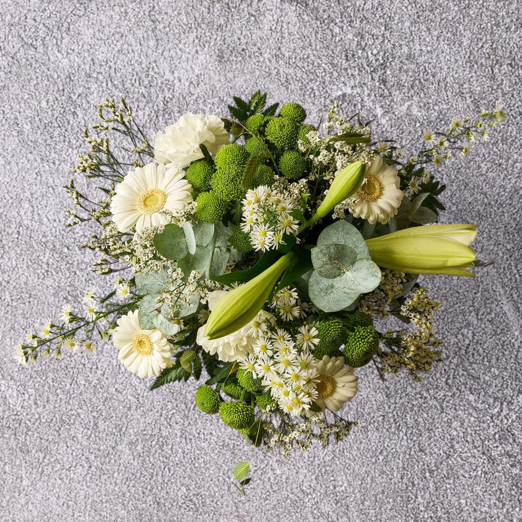 Grøn Drøm er en harmonisk buket i grønne og hvide nuancer, skabt til at give et roligt og naturligt udtryk. En frisk og elegant blomsterkreation, der bringer naturens rene energi ind i hjemmet.