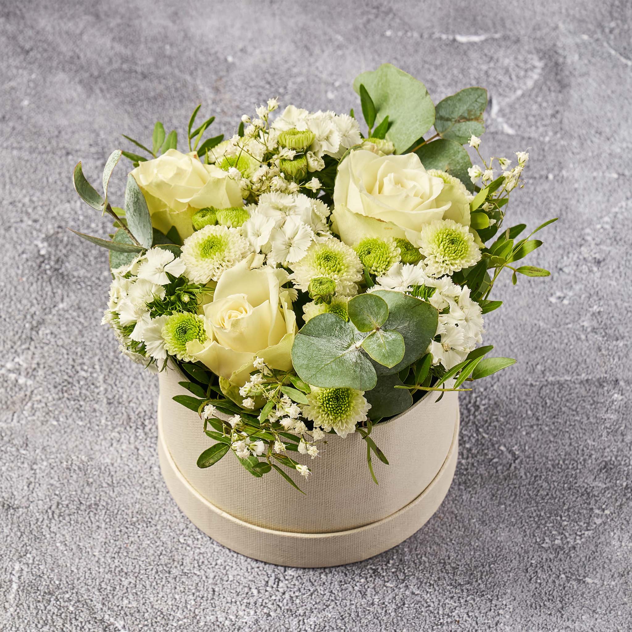 Vores Hatteæske Den Lyse er en elegant og delikat dekoration, fyldt med lyse og blide blomster i harmoniske nuancer. Præsenteret i en stilfuld hatteæske skaber buketten et luftigt og indbydende udtryk. Den tilfører lys, friskhed og en tidløs charme til ethvert rum eller fungerer som en smuk og raffineret gave.
