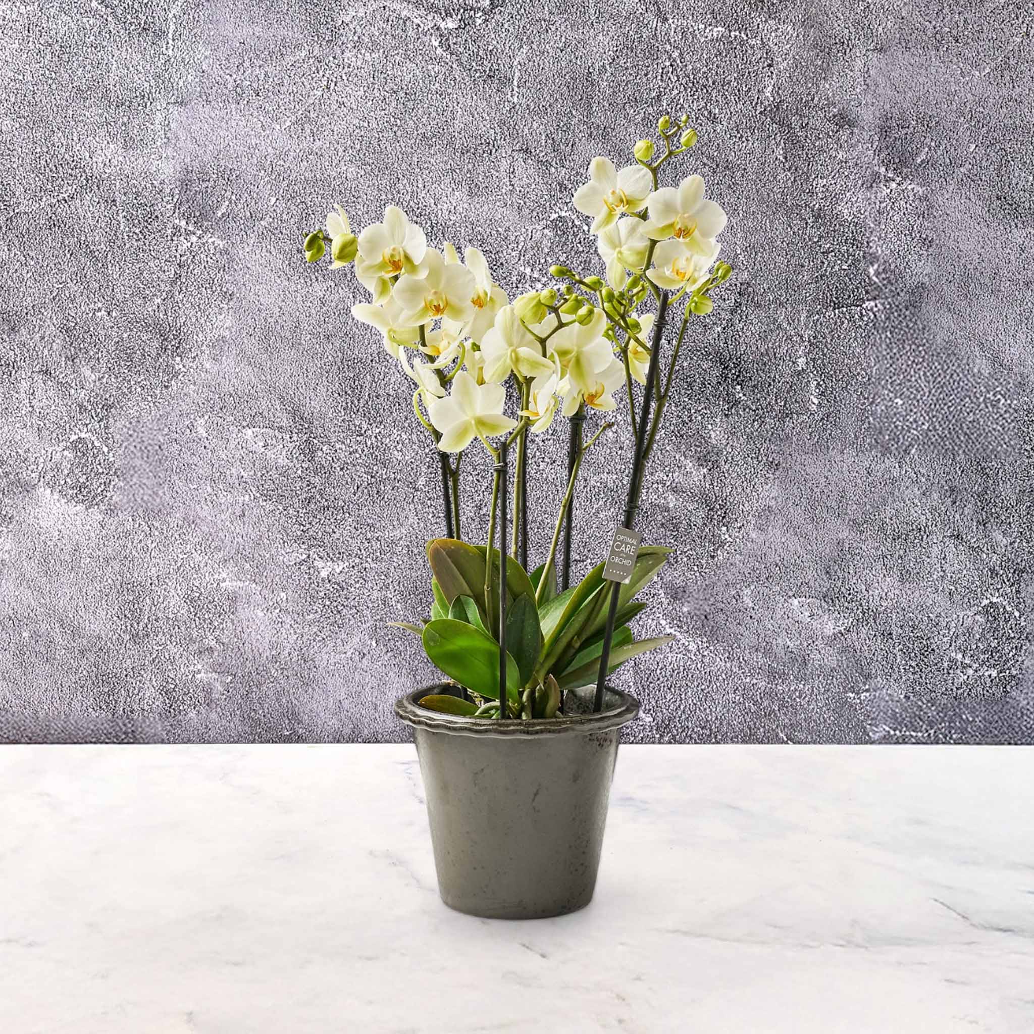 Snowy Grace er en tidløs hvid orkidé, der bringer renhed og ro ind i rummet. De klassiske hvide blomster giver et stilrent udtryk, som passer smukt ind i enhver indretning.