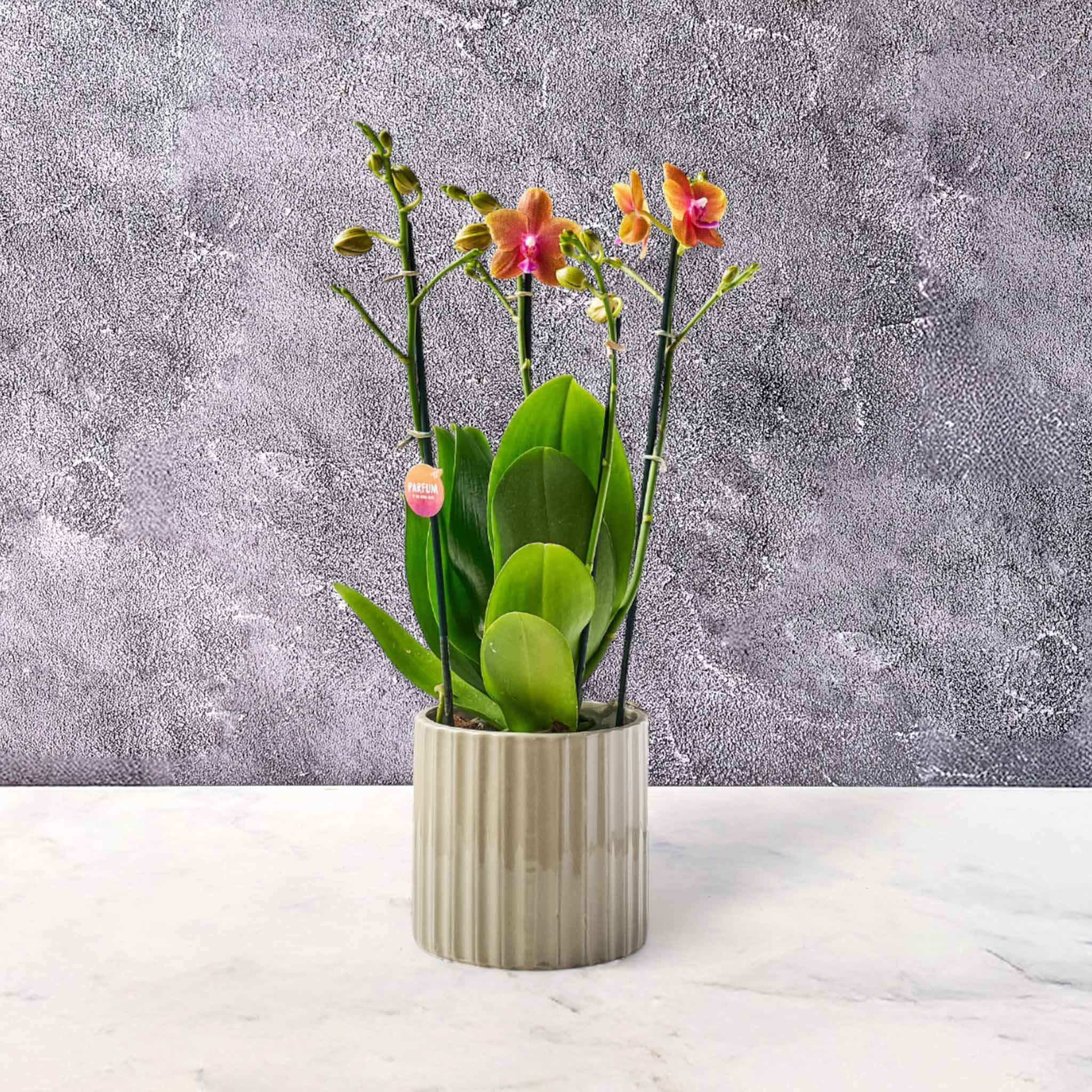 Sunset Harmony er en varm og stemningsfuld orkidé, inspireret af farverne fra en rolig solnedgang. De smukke orange og rosa nuancer skaber et indbydende og harmonisk udtryk, der spreder ro og farvespil i rummet.